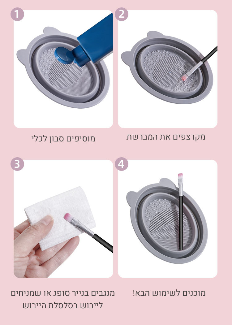 ✚ הערכה לניקוי מברשות וכלי איפור סיליקונית כוללת: קערת סיליקון מתקפלת המכילה 4 אזורי ניקוי שונים, תאפשר לך לנקות את מברשות האיפור והספוגים ביעילות, יסודיות ובקלות רבה. הערכה כוללת גם סל רשת לתלייה שמאפשר למברשות וכלי האיפור להתייבש באופן טבעי מעל הכיור.